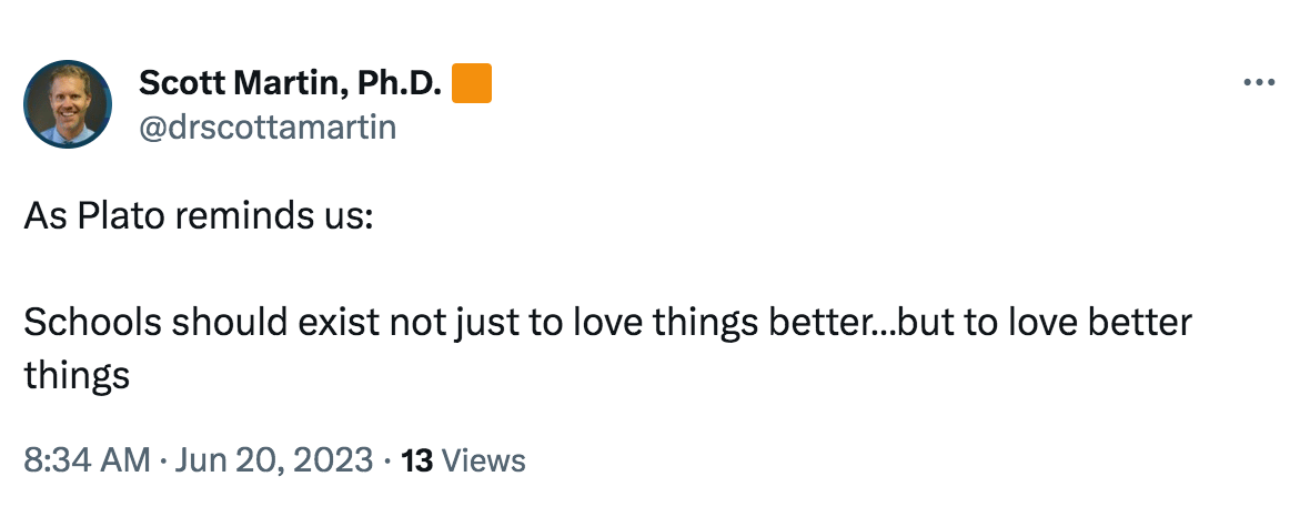 Thought Experiment: Consider all the ways things would change downstream if we went upstream and made human flourishing our primary reason for education.